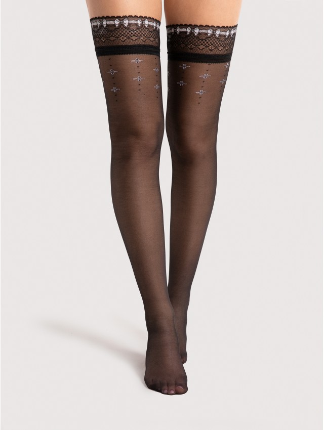 Sensuous hold-ups with a back seam pattern, sexy lace top and invisibly reinforced toe for elegance. Made from single-covered elastane yarn for durability. Smart matte finish, double silicone band for comfort.